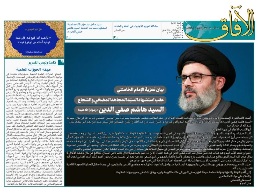- بیان تعزیة الإمام الخامنئي عقب استشهاد السید هاشم صفي الدین رضوان الله علیه