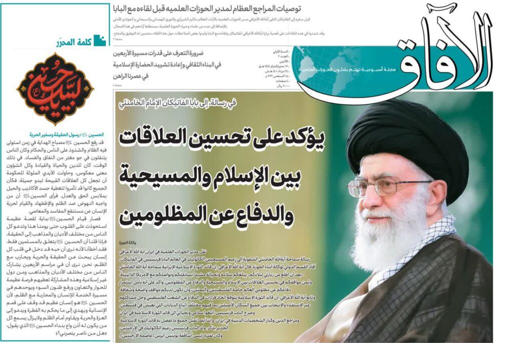 1.في رسالة إلى بابا الفاتيكان الإمام الخامنئي يؤكد على تحسين العلاقات بين الإسلام والمسيحية والدفاع عن المظلومين