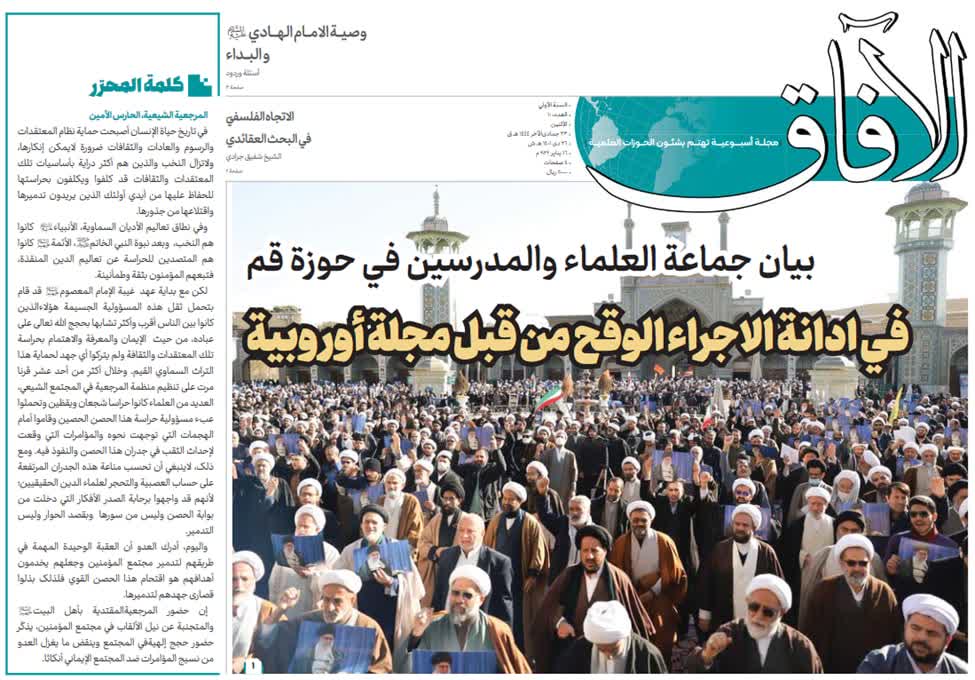 - بیان جماعة العلماء والمدرسین في حوزة قم في إدانة الاجراء الوقح من قبل مجلة أوروبیة