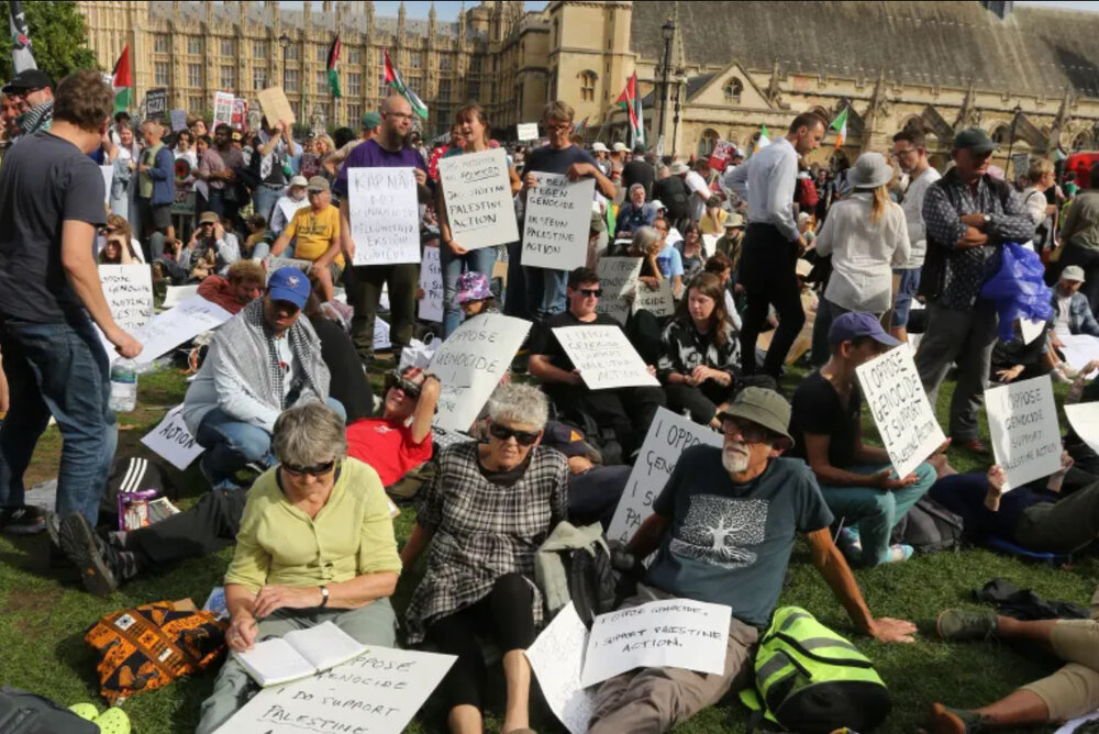كما تظاهر أكثر من ألف شخص في مظاهرة دعما لحركة “العمل من أجل فلسطين” (فلسطين أكشن) التي حظرتها الحكومة وصنفتها “منظمة إرهابية”، في واحدة من أكبر تحركات العصيان المدني الجماعي في تاريخ بريطانيا.