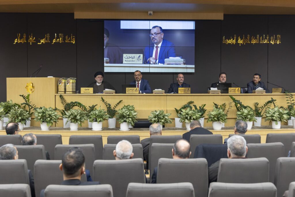 وترأس الجلسة الدكتور عادل نذير، نوقشت عبرها أربعة بحوث متنوعة شملت: (لغة التوحيد القرآني)، للباحث الدكتور عباس علي الفحام، وبحث (الشريعة في ضوء العربية نحو بناء منظومة فكرية ودراسة في العلاقات العلمية والمنهجية)، للباحث الدكتور صالح كاظم الجبوري، و(أثر الفكر النحوي في بناء قواعد أصول الفقه دراسة تحليلية في ضوء النظر اللغوي الفقهي)، للباحث الدكتور حيدر جبار عيدان، فيما اختُتمت الجلسة بمناقشة البحث الموسوم (المباحث اللغوية وأثرها في استنباط الأحكام الشرعية) للباحث الدكتور مهند مصطفى جمال الدين.
