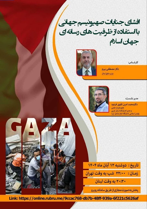 نشست مجازی «افشای جنایات صهیونیسم جهانی با استفاده از ظرفیتهای رسانهای جهان اسلام» روز دوشنبه ۱۲ آبان ۱۴۰۴ برگزار میشود. در این نشست، دکتر مصطفی سیرم، وزیر سابق لبنان، بهعنوان کارشناس حضور خواهد داشت و دکتر محمد امین تقوی فردود، عضو هیئت علمی و مدیر اندیشکده رسانه و فضای مجازی دانشگاه امام صادق(ع)، مدیریت جلسه را بر عهده دارد.
