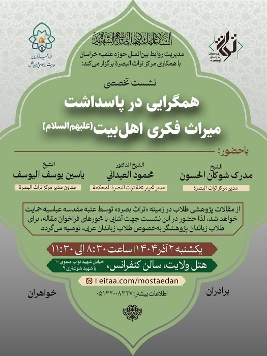 از مقالات پژوهشی طلاب در زمینه «تراث بصره» توسط عتبه مقدسه عباسیه حمایت خواهد شد، لذا حضور در این نشست جهت آشایی با محورهای فراخوان مقاله، برای طلاب زباندان پژوهشگر به خصوص طلاب زباندان عربی، توصیه می گردد