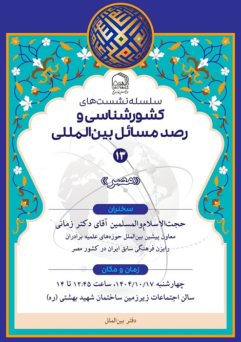 دفتر بین الملل، سیزدهمین نشست کشور شناسی با موضوع «کشور مصر» را با سخنرانی حجتالاسلاموالمسلمین زمانی معاون اسبق بینالملل حوزههای علمیه و رایزن فرهنگی اسبق ایران در مصر برگزار می کند.